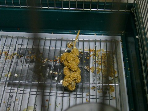 昨日の朝、先日買った粟穂を付けてあげました。 いつものように大喜びです。 おいしいよ! ところが、昨夜帰宅すると 例のねどこにちびが収まっていました(↓カメラを向けたらサッと逃げたちび)。 あれ??粟穂、どうしたの? ぼくは知らないよ。 (←この表情が絶妙ですw) かわいそうに粟穂は落とされていました。 結構しっかりつけたのに。 なんとなく無残。。。 どうしようかと協議の結果 同居人と協議中 結局2つ付けることに。 ←粟穂用 ←寝床用 寝床用、使ってくれるかしら? 今夜の帰宅が楽しみです。 ←ポチッとお願いします☆