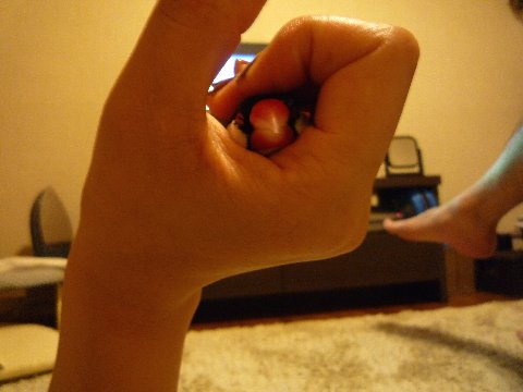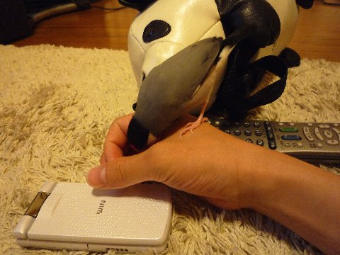 終わった後、ちびはいつものようにお怒りで、手を出すと高速突きで応戦してきます。