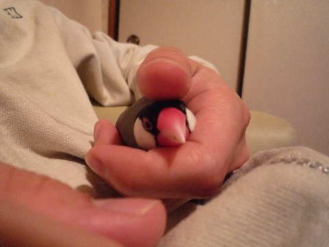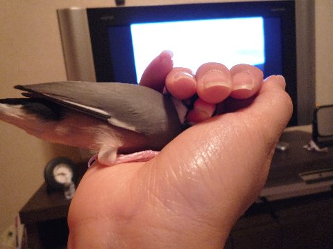 夜の放鳥時、ちびは手の中に入りたがり、